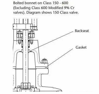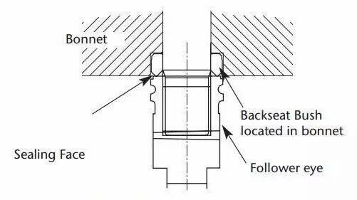 后座的原理只能在不太可能發(fā)生壓蓋泄漏的情況下使用,以將壓蓋與系統(tǒng)壓力隔離,直到工廠停機并進行維修。在任何情況下,為了修理有問題的密封壓蓋,都不應在系統(tǒng)受壓的情況下取出后座。在正常操作下,閥門只能打開到后座的3mm內(nèi)。